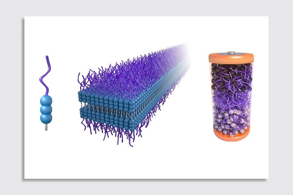 تصوير للبطاريات المصنوعة من مواد الإلكتروليت الجديدة للباحثين في معهد ماساتشوستس للتكنولوجيا ، والتي تتكون من فئة من الجزيئات التي تجمع ذاتي في الماء ، يدعى أمفيفيل أراميد (AAS) ، التي تحاكي هياكلها الكيميائية والاستقرار كيفلار. (الصورة: بإذن من الباحثين/تحريرهم من قبل معهد ماساتشوستس للتكنولوجيا)